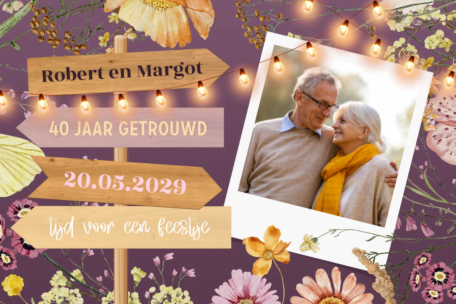 Feestelijke uitnodiging voor een veertig jarig huwelijksjubileum met eigen foto. Op deze kaart staat een wegwijzer met tekst die eenvoudig zelf aan te passen is in onze online editor. Voeg jullie eigen foto toe voor de persoonlijke touch. De aquarel bloemen en de slinger met lampjes geven een gezellige sfeer aan deze kaart. Met deze uitnodiging kunnen jullie de gasten op een feestelijke en persoonlijke manier uitnodigen om deze speciale gelegenheid te vieren.