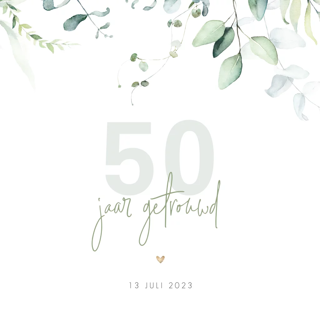 Romantische aquarel 50 jaar getrouwd uitnodiging met sierlijke bloemen. Het kleine hartje maakt deze uitnodiging helemaal af.