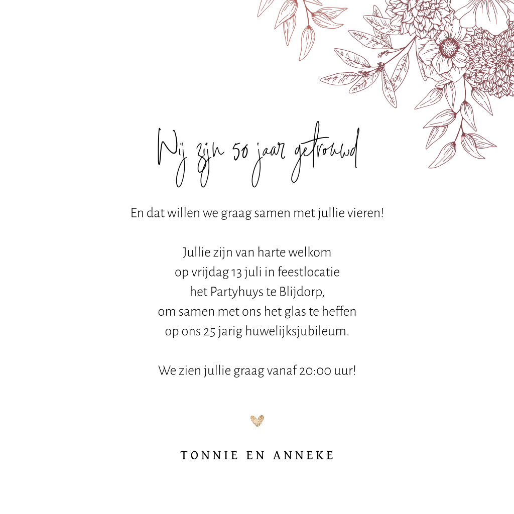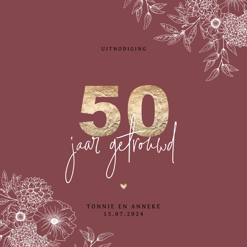 Een stijlvolle jubileumkaart om jullie 50-jarig huwelijksjubileum aan te kondigen. Op deze uitnodigingskaart staan sierlijke bloemen en een goudkleurig kader. Deze combinatie geeft de kaart een romantische uitstraling.