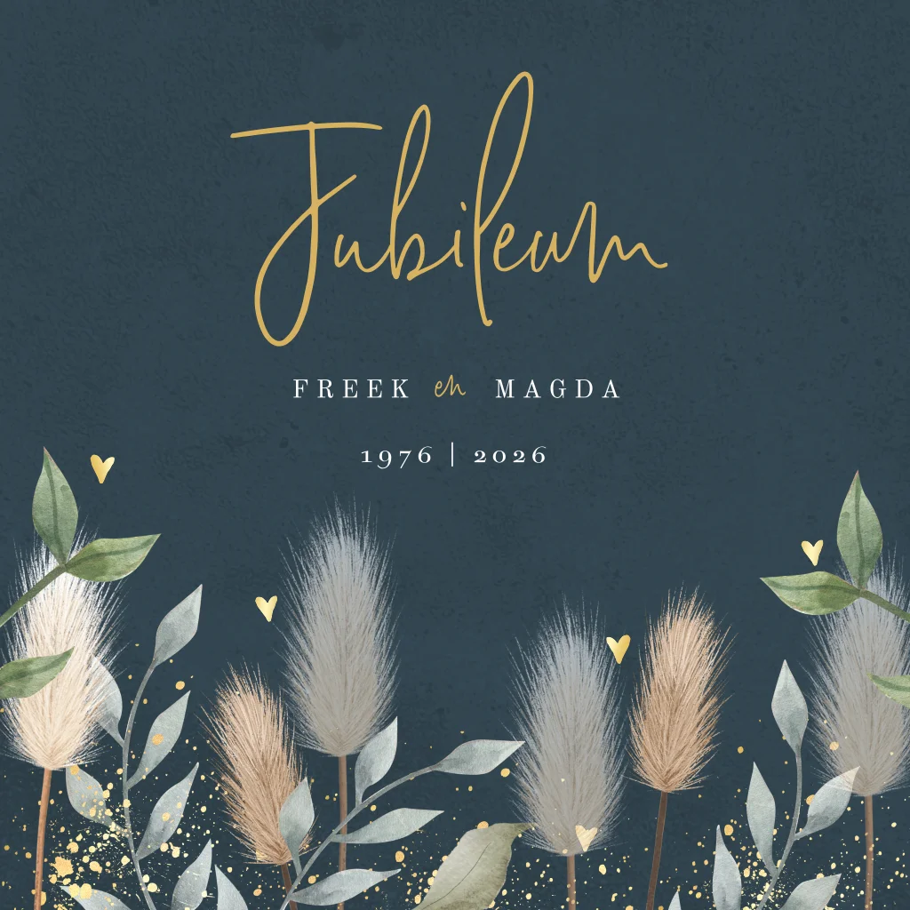 Stijlvolle uitnodiging voor een 50-jarig huwelijk met mooie droogbloemen. Deze jubileumkaart heeft een donkerblauwe achtergrond met een structuur, dit geeft een mooi effect. De teksten en kleuren zijn aan te passen in de editor. Zo is deze kaart ook met een paar klikken aan te passen naar een ander bruiloftsjaar.
