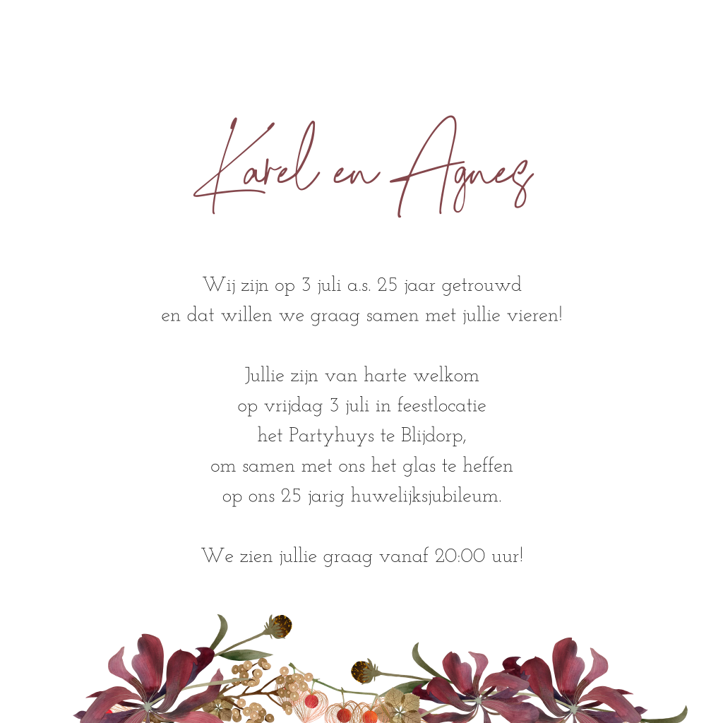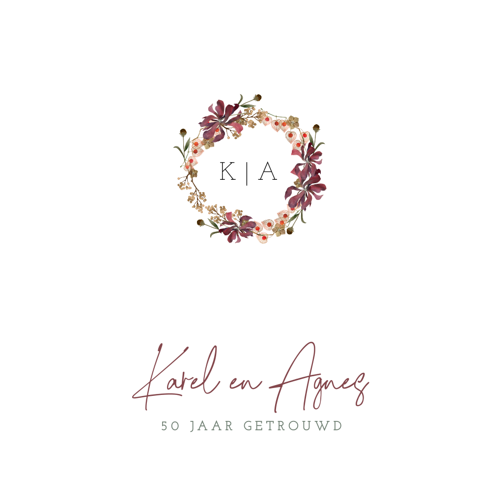Romantische en sierlijke 50 jaar getrouwd uitnodiging met sierlijke bloemen. De bloemen in groen en paarse tinten vormen een mooie rand om de initialen. Deze jubileumkaart is tijdloos en chique.