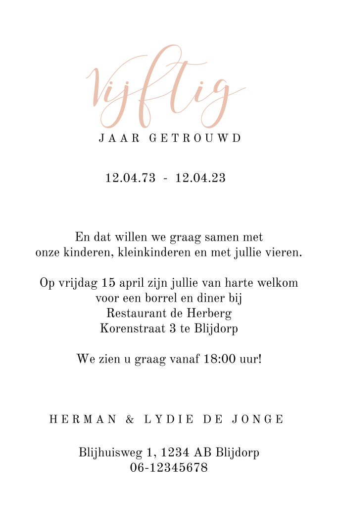 Mooie uitnodiging voor een 50-jarig huwelijk. Deze jubileumkaart is overwegend wit met mooie droogbloemen in zachte roze en bruine tinten. Met een paar klikken kun je deze kaart naar je eigen wensen aanpassen. Liever getal 50 ipv voluit geschreven? Of andere kleuren? Dit is aan te passen in de editor.