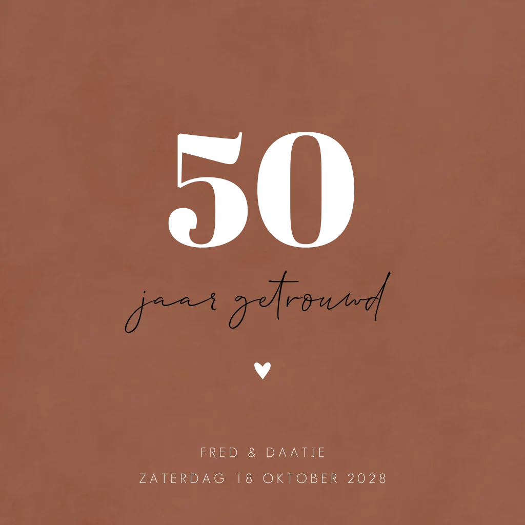 Strakke jubileumkaart voor 50 jaar getrouwd. Op deze uitnodiging een mooie combinatie van sierlijke en strakke lettertypes voor een bruin koperkleurige velvetlook achtergrond. De glanzende foliedruk geeft deze uitnodiging een luxe uitstraling. De kleuren pas je eenvoudig aan in onze editor. Hulp nodig bij het aanpassen? We staan voor je klaar!
