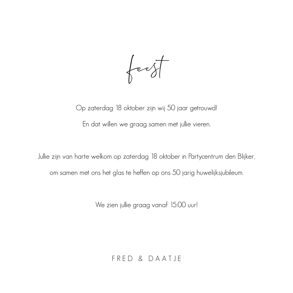 Deze uitnodigingskaart kun je naast een 50-jarig huwelijksjubileum ook gebruiken wanneer je wilt vieren dat je bijvoorbeeld 25 jaar samen bent of een werk gerelateerd jubileum feest wilt geven.