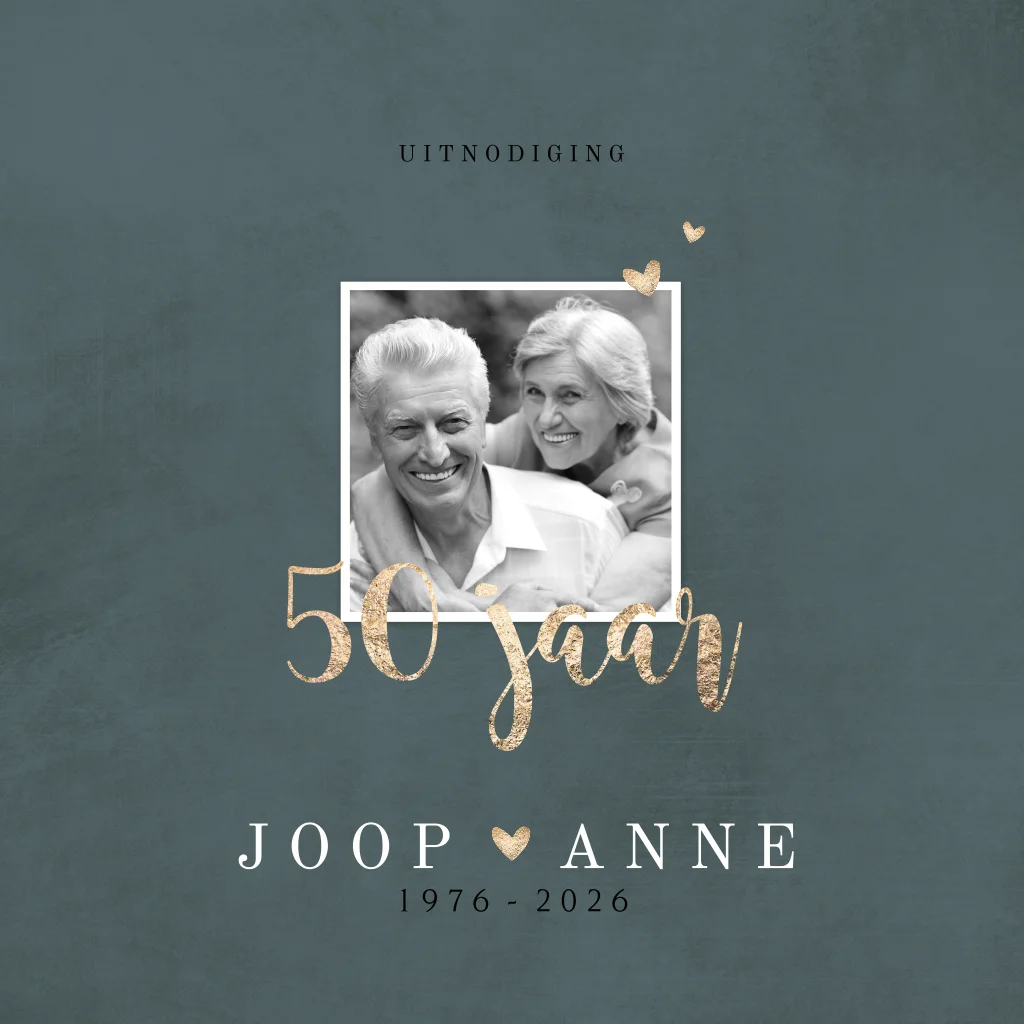 Uitnodiging voor een 50-jarig huwelijks jubileum met een basic design en ruimte voor een eigen foto. Op deze jubileumkaart staat in goudlook "50 jaar" en de ruwe achtergrond geeft een leuk effect. Pas deze uitnodigingskaart naar je eigen smaak aan in de editor en combineer met een mooie envelop om het helemaal af te maken.