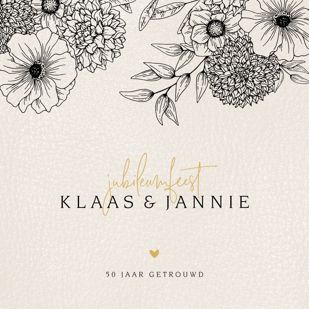 Mooie uitnodiging voor een gouden bruiloft met getekende bloemen. Deze jubileumkaart voor 50 jaar getrouwd heeft een lichte leder look achtergrond en er is gebruik gemaakt van zowel een strak als een sierlijk lettertype. Je kunt deze kaart zelf bewerken in de editor en naar je eigen wensen aanpassen. Ook geschikt voor andere bruiloftsjaren.