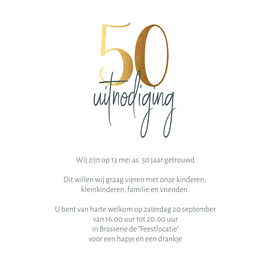 Huwelijksuitnodiging voor 50 jaar getrouwd met een mooie donkergroene achtergrond en een goudkleurige 50. De kaart wordt extra persoonlijk door het plaatsen van jullie eigen foto.
