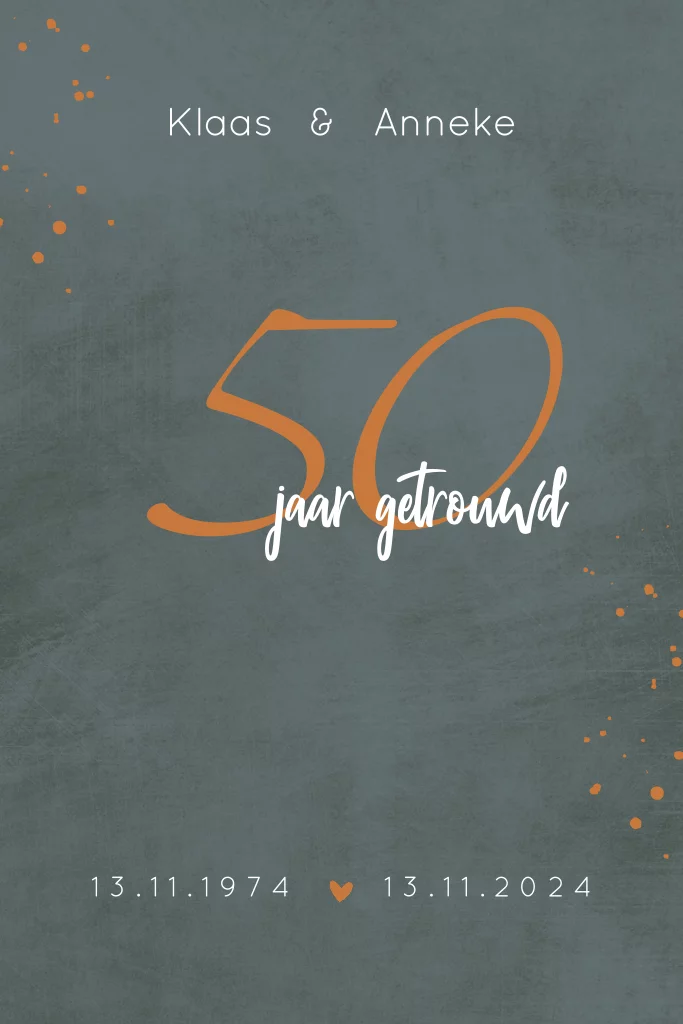 Hippe uitnodigingskaart om jullie 50-jarig huwelijksfeest te vieren. Deze jubileumkaart voor een gouden huwelijk heeft een ruwe donkergroene achtergrond met tekst in wit en koperkleur. Een mooie combinatie. De spetters in geven een leuk effect. Liever andere kleuren of lettertypes? Dit pas je eenvoudig aan in de editor.