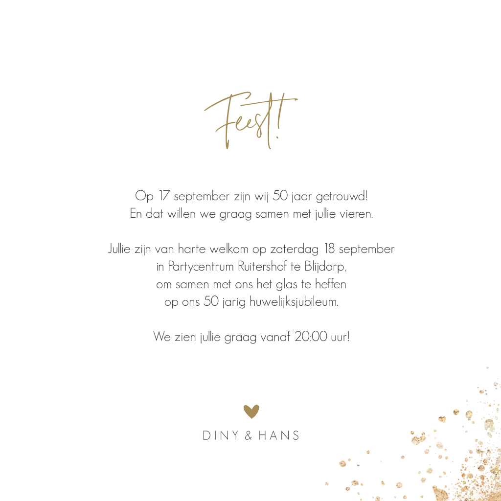 Uitnodiging voor een 50-jarig huwelijksjubileum. Op deze jubileumkaart een zalmroze aquarel, goudkleurige spetters en sierlijke letters. Alle teksten en lettertypes zijn aan te passen in de editor. Deze kaart is ook te gebruiken voor andere bruiloftsjaren.