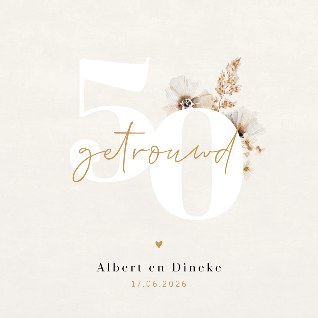 Stijlvolle jubileumkaart voor 50 jaar getrouwd. Vier jullie gouden huwelijk met deze prachtige uitnodiging. Door de linnenlook en aquarel veldbloemen op de achtergrond heeft deze kaart een romantische uitstraling.