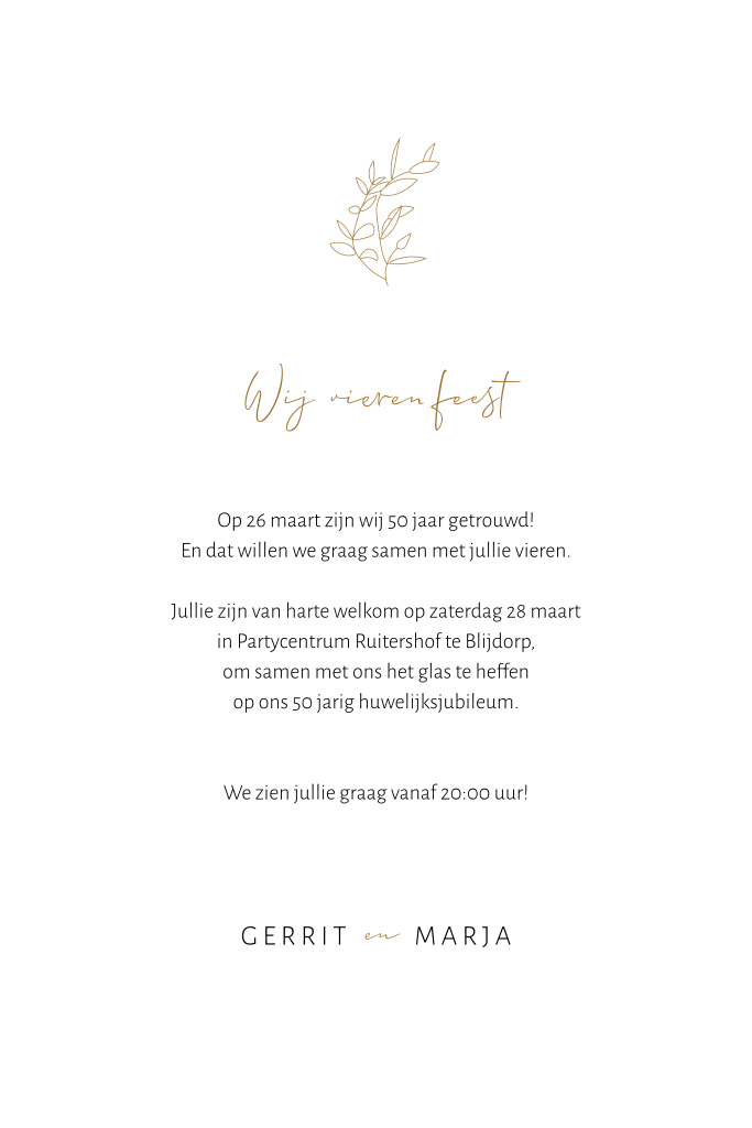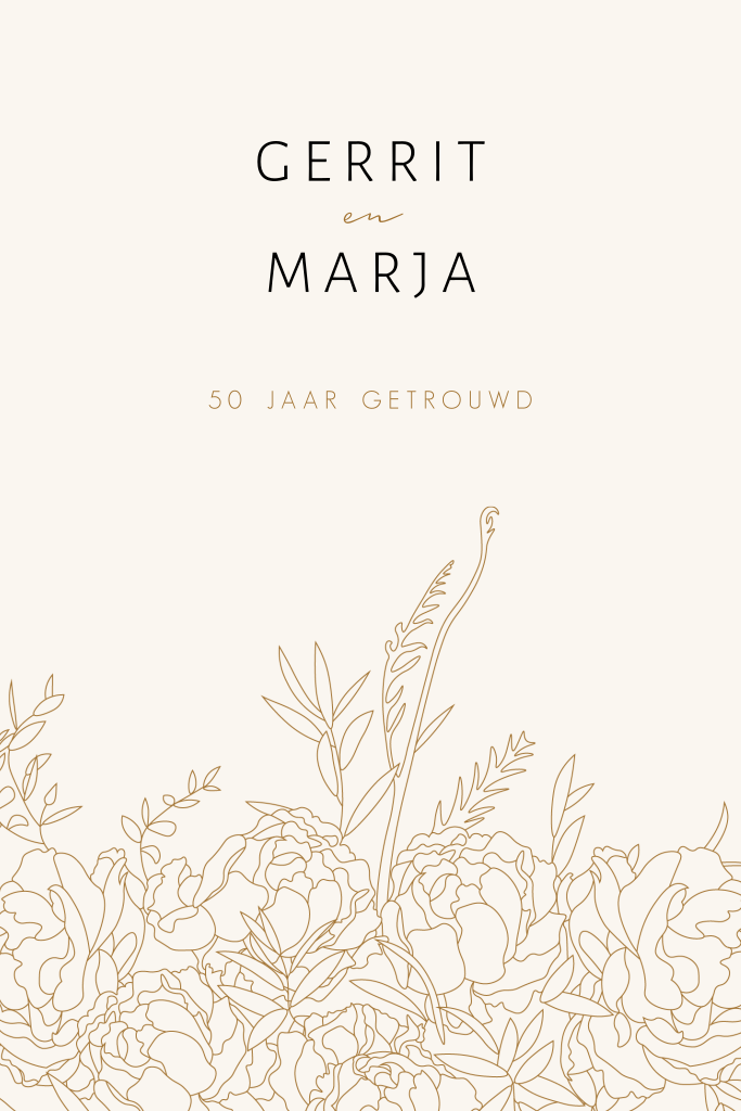 Wanneer je op zoek bent naar een stijlvolle en klassieke jubileumkaart, is deze beige uitnodiging met een outline lijntekening van bloemen perfect. Deze uitnodigingskaart is ontworpen om te vieren dat jullie 50 jaar getrouwd zijn maar is ook geschikt voor andere bruiloftsjaren. Of wanneer je wilt vieren dat jullie bijvoorbeeld 25 jaar samen zijn. De teksten en getallen pas je gemakkelijk aan in de editor. Vragen of wensen? Laat het gerust weten, wij helpen je graag.