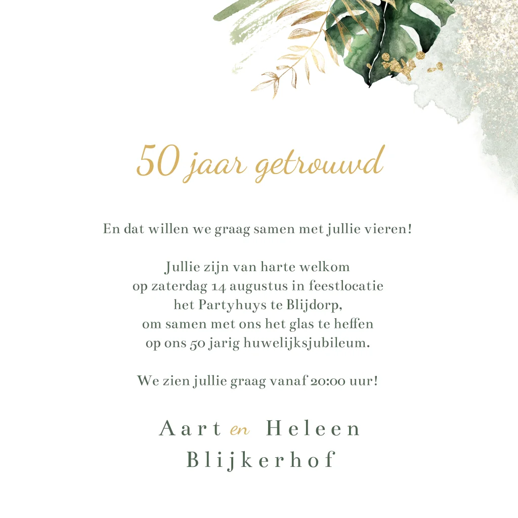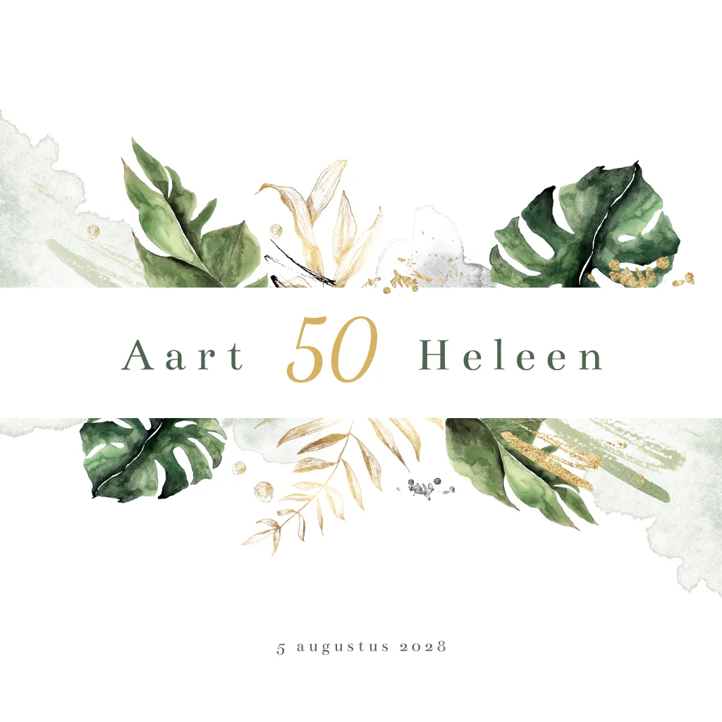 Botanische jubileumkaart voor 50 jaar getrouwd. Op deze uitnodiging staan verschillende groene en goudkleurige botanische bladeren, spetters en aquarel. Pas de kleuren en teksten naar wens aan in de editor. Ook mogelijk voor andere bruiloftsjaren.