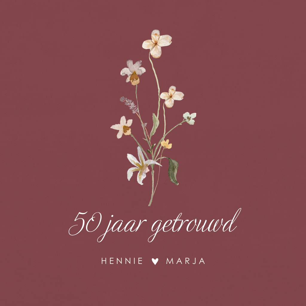 Op zoek naar een unieke en stijlvolle jubileumkaart? Kies dan voor deze klassieke uitnodiging voor 50 jaar getrouwd met prachtige aquarel bloemen en sierlijke letters in glanzend goudfolie. De foliedruk geeft deze jubileumuitnodiging een luxe, exclusieve uitstraling! Het sierlijke lettertype geeft deze kaart een klassieke touch. De kleur van de foliebedrukking en de teksten kun je in de ontwerpmodule aanpassen. Vragen? Laat het ons weten!