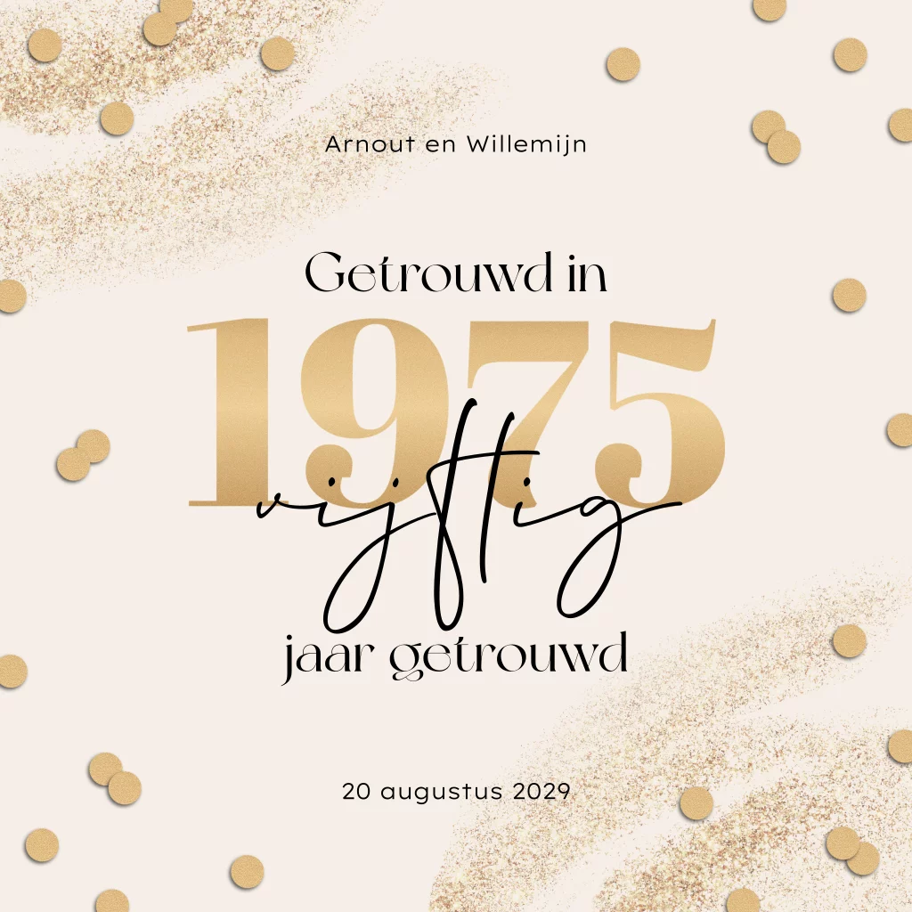 Vier je 50-jarig huwelijksjubileum met een goudlook uitnodiging met confetti! Deze jubileumkaart is perfect voor een feestelijke gelegenheid. De beige tinten zorgt voor een rustige uitstraling. Pas deze kaart naar eigen wens aan in de online editor en vier jullie 50 jarig jubileum.