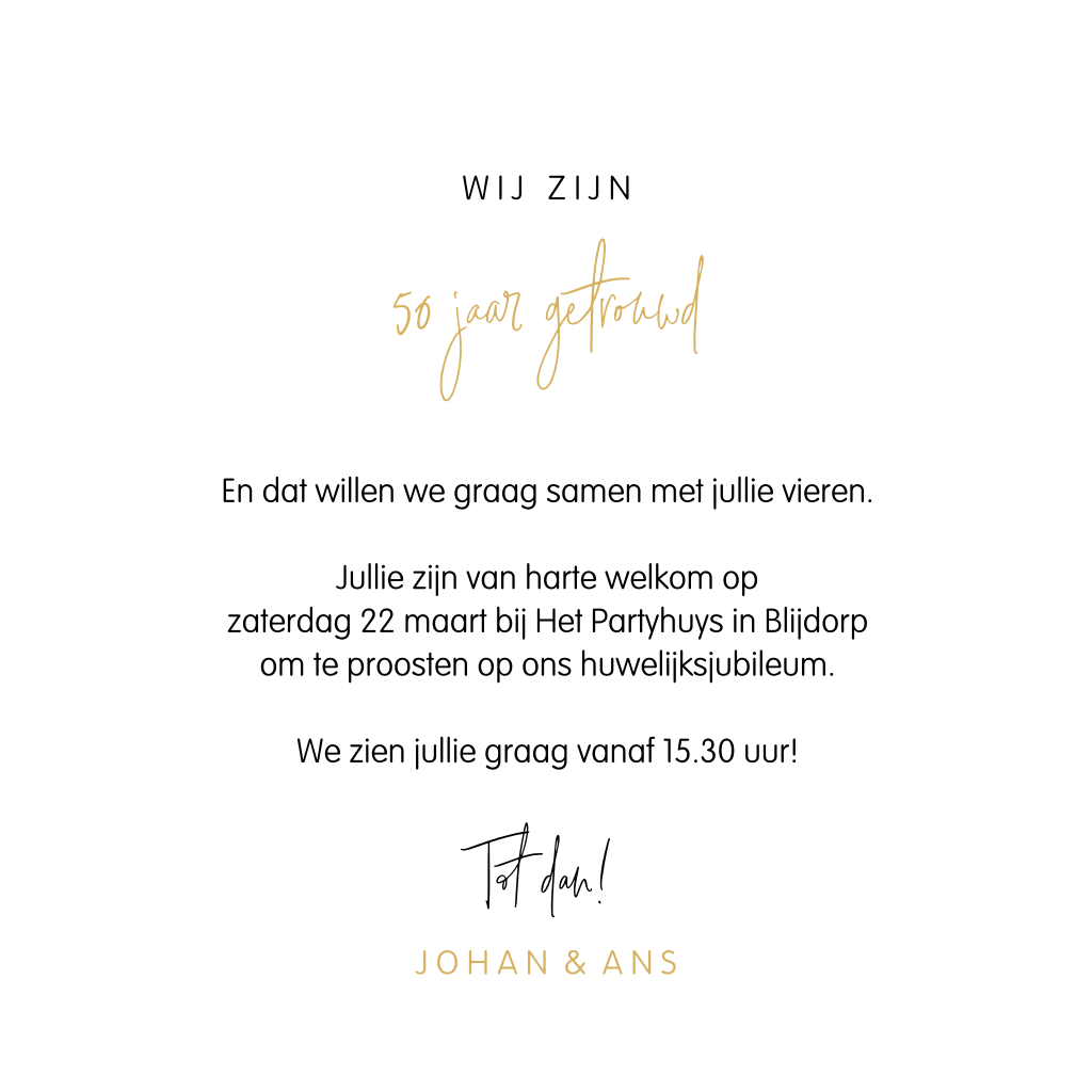 Moderne uitnodiging voor een 50 jaar huwelijks jubileum. Deze stijlvolle jubileumkaart heeft door de combinatie van goudkleur met wit een frisse look. De proostende champagne glazen met subtiele goudkleurige spetters maken de kaart extra feestelijk.