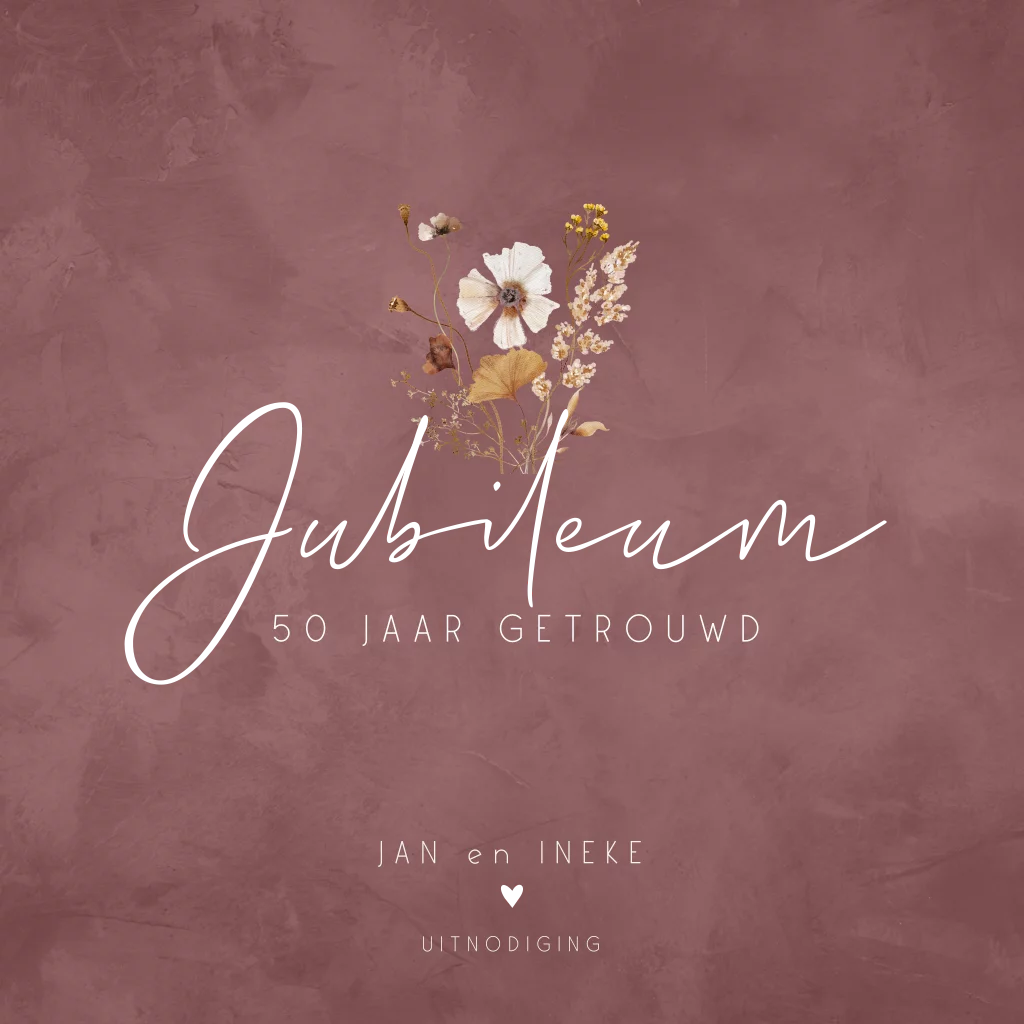 Stijlvolle jubileumkaart voor 50 jaar getrouwd. Op deze uitnodiging staan prachtige bloemen voor een ruwe bordeauxrode achtergrond. De teksten en lettertypes zijn aan te passen in de editor. Zo is deze kaart ook te gebruiken voor andere bruiloftsjaren. Deze kaart is voorzien van goudfolie. De kleur van de foliebedrukking kun je in de ontwerpmodule aanpassen.