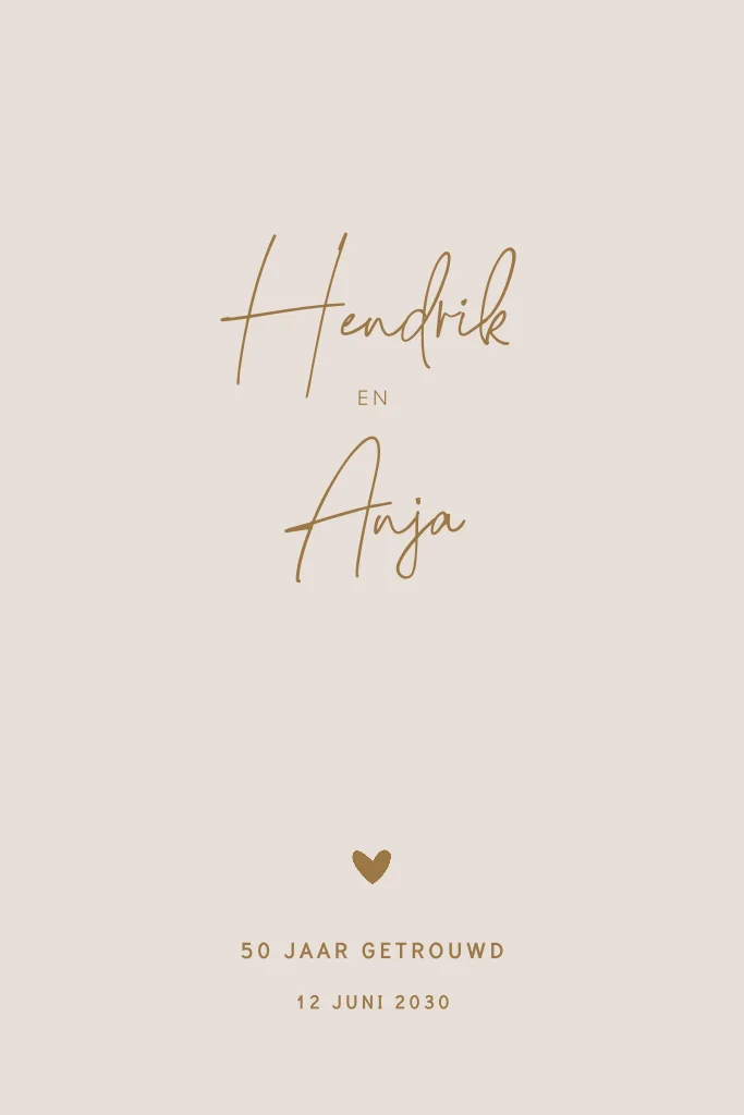 Deze jubileumuitnodiging voor 50 jaar getrouwd heeft een basic beige design met een bruin hartje en verschillende lettertypes, strak en handgeschreven. Teksten en kleuren zijn makkelijk aan te passen in onze editor.