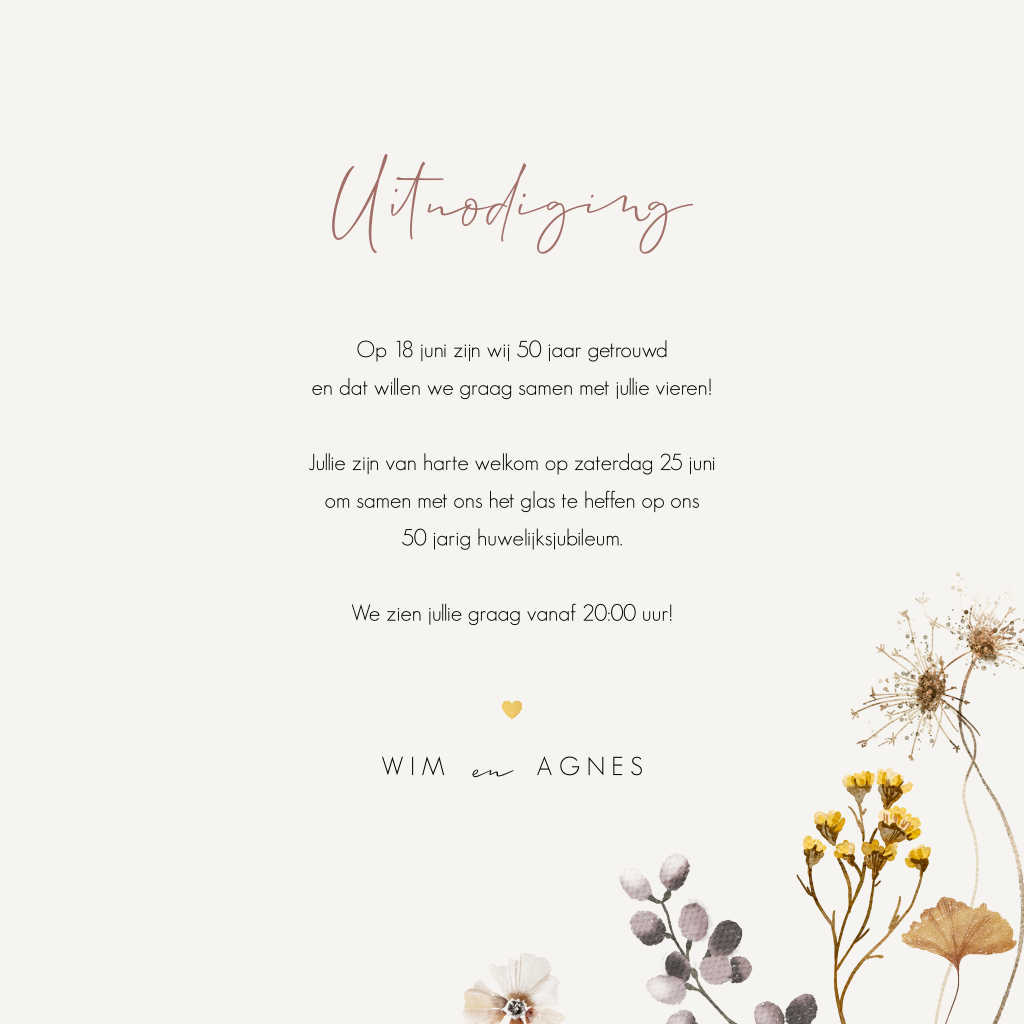 Uitnodiging jubileum 50 jaar getrouwd bloemen met goudlook