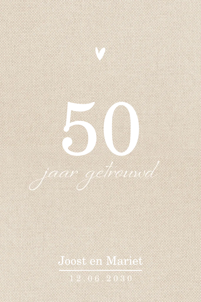 Basic jubileumkaart in beige linnenlook met luxe glanzende goudfolie. Deze jubileumuitnodiging voor 50 jaar getrouwd heeft een rustige uitstraling maar is toch stijlvol door de zachte kleurencombinatie van beige met wit en goud. De afgeronde hoeken maken het wat minder strak. Verstuur de uitnodigingen in een mooie witte envelop met gouden inlay voor een complete look.