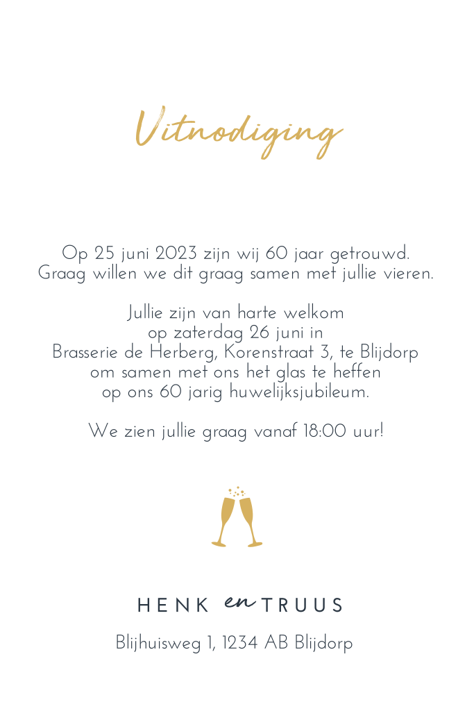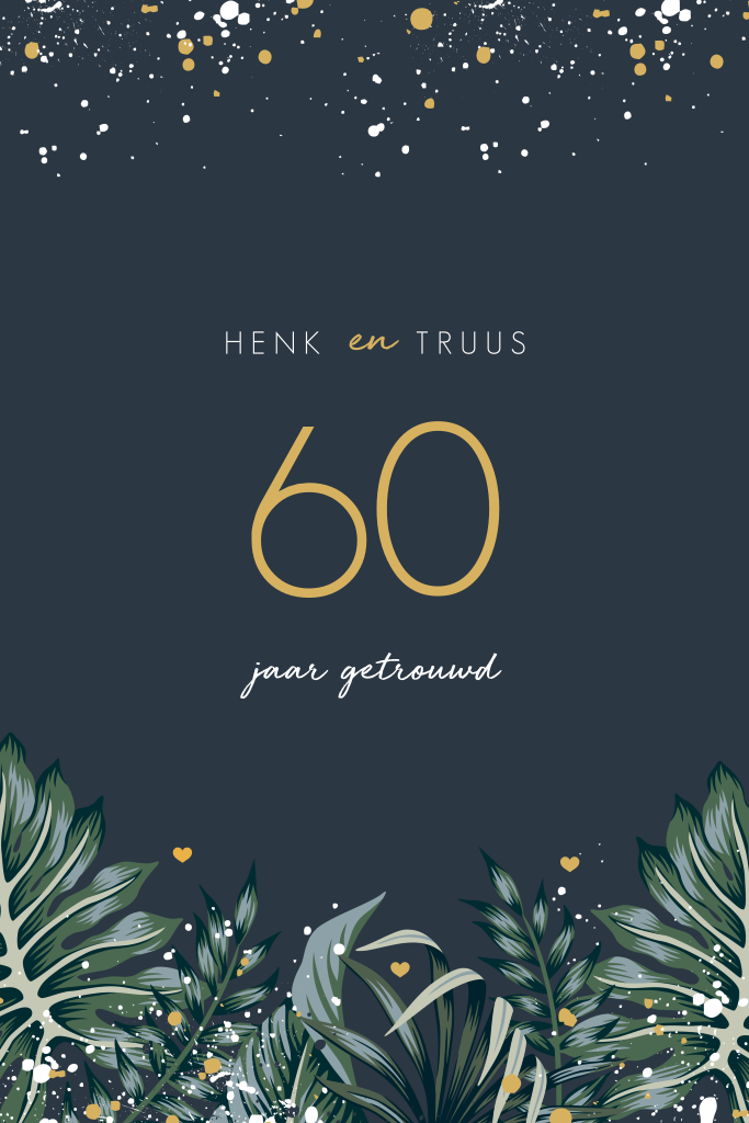 Deze jubileumkaart voor 60 jaar getrouwd is stijlvol en heeft mooie botanische bladeren. Deze uitnodiging heeft een warme donkerblauwe achtergrond met tekst in wit en goudkleur, een mooie combinatie. De kleine goudkleurige hartjes maken de kaart af. Deze 60 jaar getrouwd kaart past perfect bij een diamanten huwelijk en is eenvoudig aan te passen in onze editor.