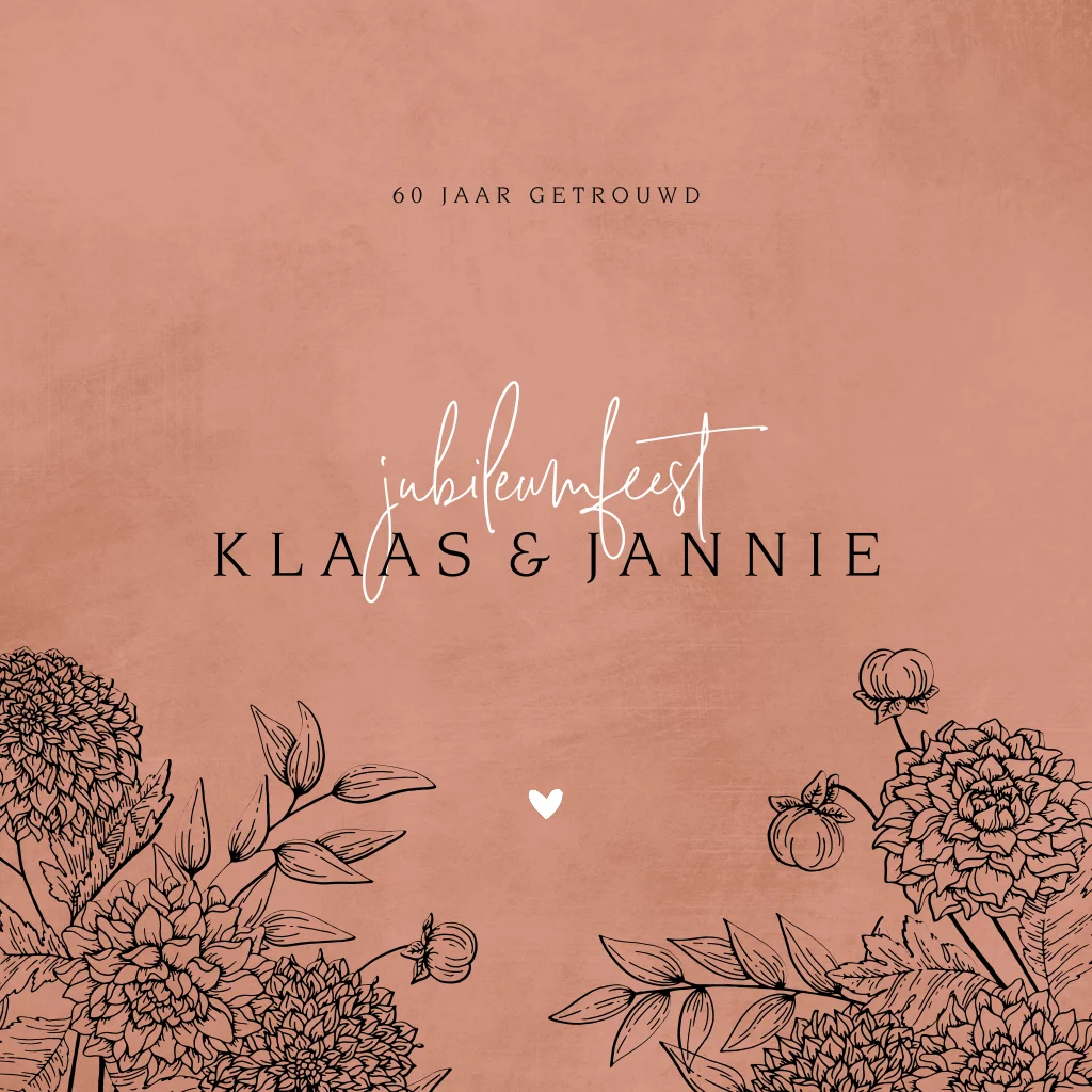 Mooie uitnodiging voor een diamanten bruiloft met getekende bloemen. Deze jubileumkaart voor 60 jaar getrouwd heeft een warme terra achtergrondkleur en er is gebruik gemaakt van zowel een strak als een sierlijk lettertype. Je kunt deze kaart zelf bewerken in de editor en naar je eigen wensen aanpassen. Ook geschikt voor andere bruiloftsjaren.