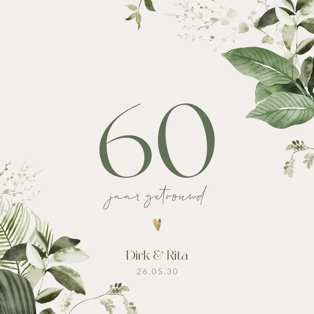 Jubileumkaart met botanische bladeren om te vieren dat jullie 60 jaar getrouwd zijn en een feestje geven. Deze jubileumkaart heeft een beige achtergrond met groene botanische bladeren. Het gouden hartje geeft een romantische touch. Pas de kaart geheel naar eigen wens aan in de editor. Vragen? Laat het ons weten!