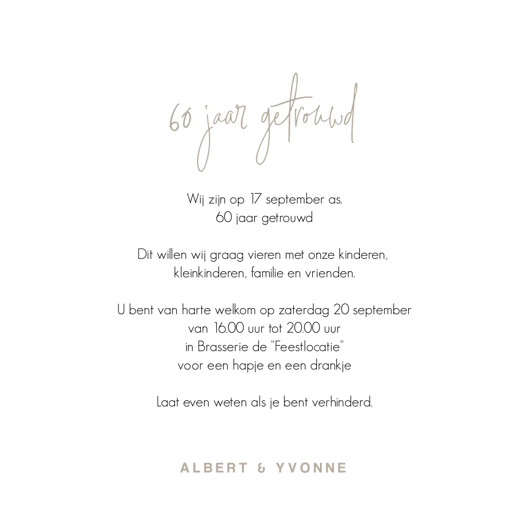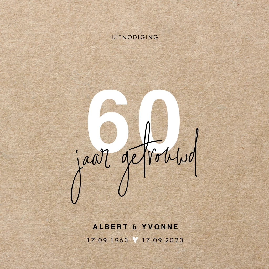 Rustige uitnodigingskaart voor een 60 jaar getrouwd op karton achtergrond. Op de kaart staat het getal 60 centraal op de voorkant. In mooie sierlijk letters staat 60 jaar getrouwd.