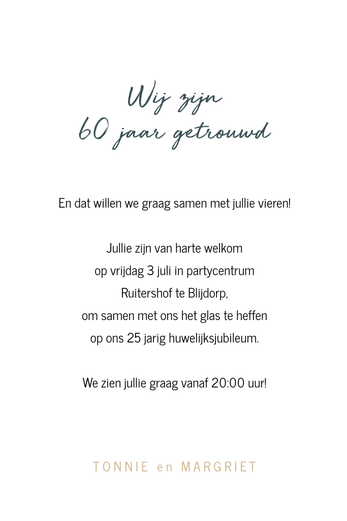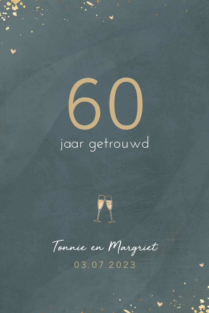Mooi jubileumkaartje met goud tinten en champagne glazen. Deze 60 jaar getrouwd kaart is eenvoudig aan te passen.