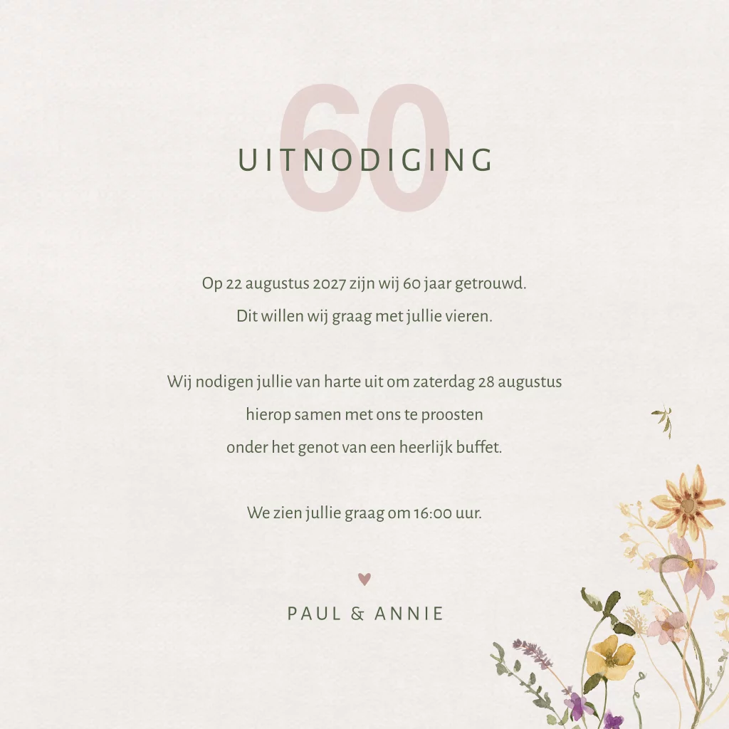 Klassieke jubileumkaart voor een 60-jarig huwelijksjubileum. Op deze beige kaart staan prachtige aquarel bloemen in gele, paarse en roze tinten. De tekst is sierlijk gecombineerd met een strak lettertype. Deze jubileum uitnodigingskaart met bloemen kun je zelf gemakkelijk bewerken, opslaan en bestellen.