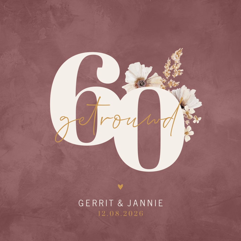 Stijlvolle jubileumkaart voor een diamanten huwelijk, 60 jaar getrouwd. Op deze uitnodiging staan prachtige aquarel bloemen voor een ruwe bordeauxrode achtergrond. De teksten en lettertypes zijn aan te passen in de editor. Zo is deze kaart ook te gebruiken voor andere bruiloftsjaren. Vragen of wensen? Laat het gerust weten, wij helpen je graag.