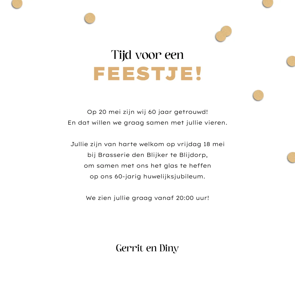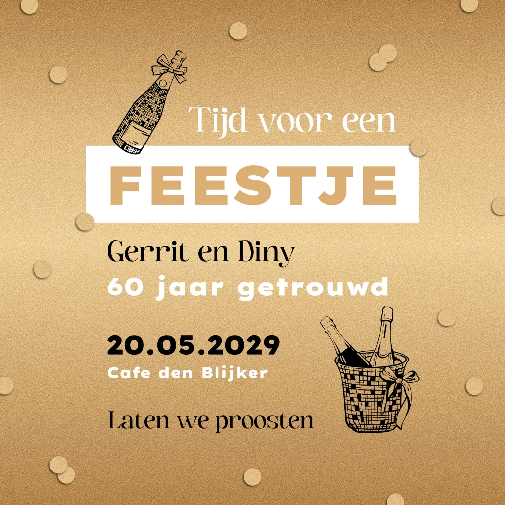 Feestelijke jubileumkaart om te vieren dat jullie 60 jaar getrouwd zijn. Deze huwelijksjubileum uitnodiging heeft een goudlook met gouden confetti en champagne met de toepasselijke tekst 'Tijd voor een feestje'. De combinatie van de goudenlook en de antiek gouden envelop zorgen voor een chique uitstraling.