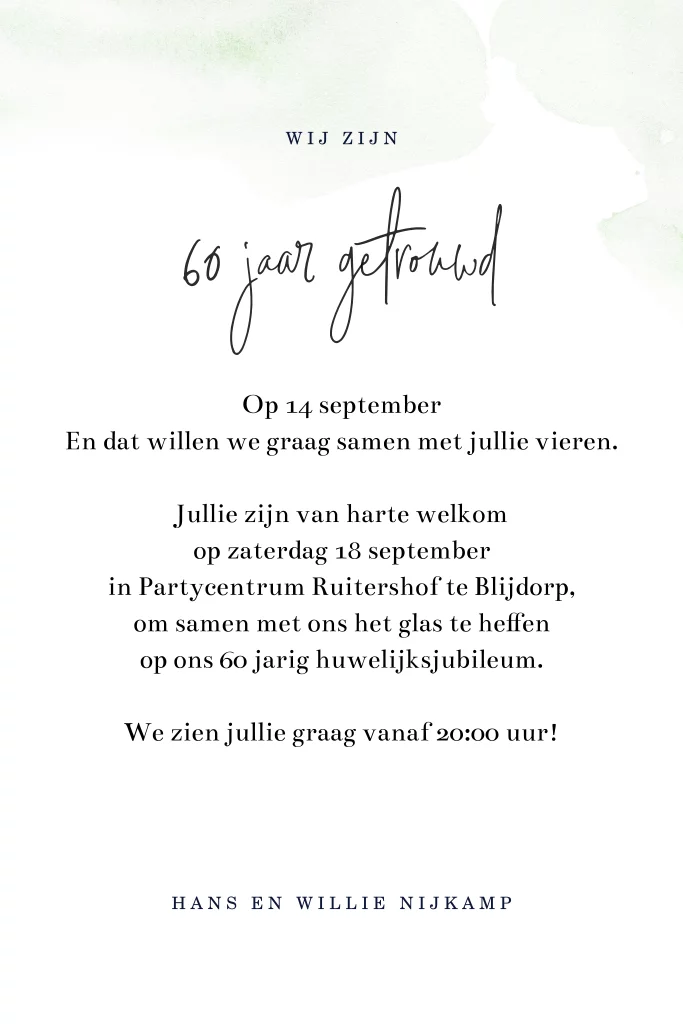 Aquarel uitnodigingskaart voor een zestig jarig huwelijksjubileum. Op deze kaart staat eucalyptus en een eigen foto. Deze 60 jaar getrouwd kaart past perfect bij een diamanten huwelijk en is eenvoudig aan te passen in onze editor.