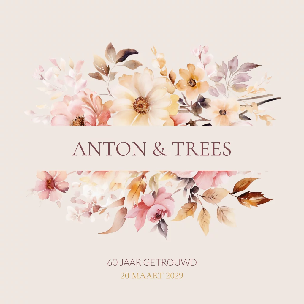 Prachtige kaart met bloemen en een kader voor jullie namen. Dit is een romantische uitnodiging die ideaal is voor het aankondigen van jullie 60-jarig huwelijksjubileum. De geïllustreerde bloemen zorgen voor een romantische stijl. Pas deze jubileumkaart naar eigen wens aan in onze online editor en maak er een onvergetelijk feest van.