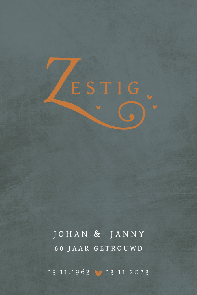 Rustige uitnodigingskaart met subtiele, kleine hartjes om jullie diamanten huwelijk te vieren. Deze jubileumkaart voor 60 jaar getrouwd heeft een donkere betonlook achtergrond met tekst in wit en koperkleur. Een mooie combinatie. Liever andere kleuren of lettertypes? Dit pas je eenvoudig aan in de editor.