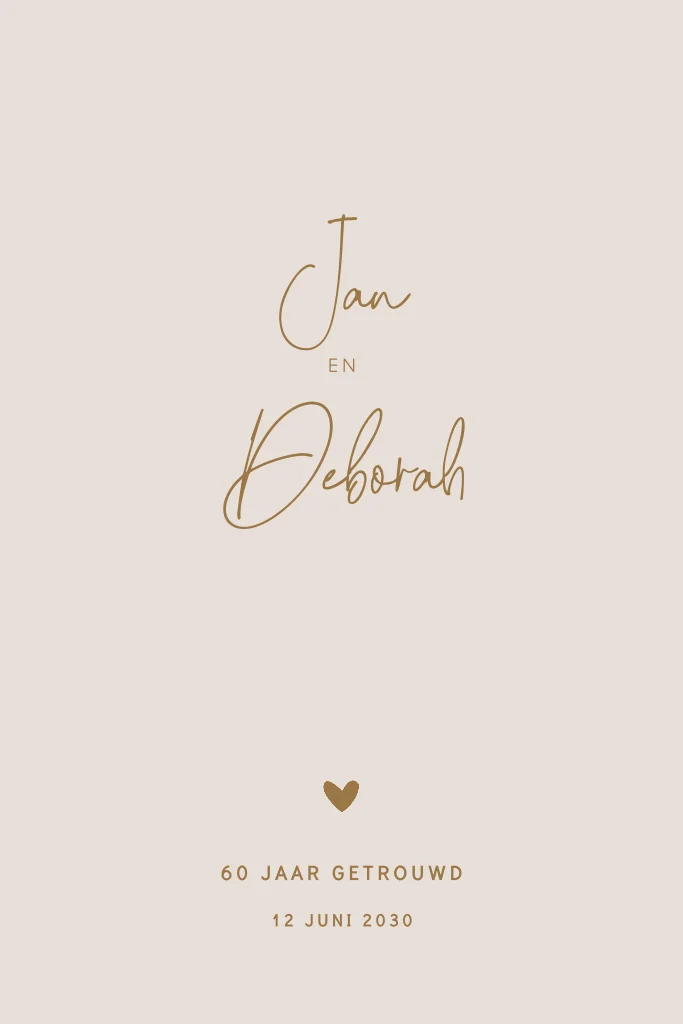 Een eenvoudige trendy jubileumkaart met een bruin hartje. Deze jubileumuitnodiging voor 60 jaar getrouwd heeft een basic beige design. Teksten en kleuren zijn makkelijk aan te passen in onze editor.