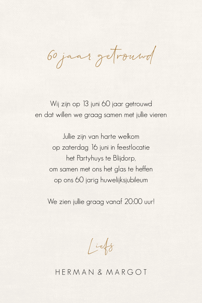Deze uitnodigingskaart is ontworpen om te vieren dat jullie 60 jaar getrouwd zijn maar is ook geschikt voor andere bruiloftsjaren zoals een 50 jarig huwelijksjubileum. Of wanneer je wilt vieren dat jullie bijvoorbeeld 25 jaar samen zijn. De teksten en getallen pas je gemakkelijk aan in de editor. Vragen of wensen? Laat het gerust weten, wij helpen je graag.