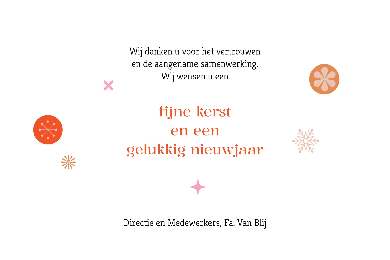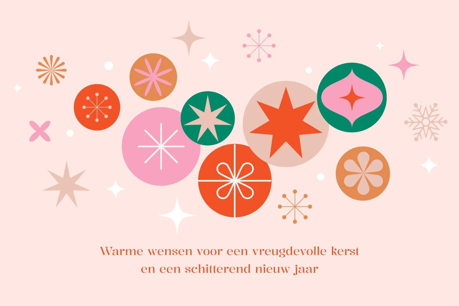 Op zoek naar een kleurrijke zakelijke kerstkaart? Ontdek dan deze kleurrijke kerstkaart met allerlei moderne kerstelementen. Op deze kerstkaart zie je verschillende formaten cirkels naast elkaar staan. In deze cirkels zie je verschillende kerststerretjes en een cadeautje. Door de verschillende kleurtjes van de cirkels is het een kleurrijk ontwerp om te ontvangen in de brievenbus. Met de petrol envelopkleur maak je deze kaart helemaal af. Teksten en lettertypes zijn aan te passen in onze online editor.