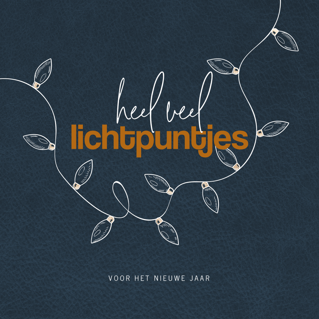 "Heel veel lichtpuntjes voor het nieuwe jaar", dat is wat je iedereen natuurlijk van harte toewenst voor het komende jaar! Met deze kerstkaart steun je ook nog eens een heel goed doel: het Ronald McDonald Huis Zwolle. Op deze kerstkaart een sfeervolle lichtslinger voor een donkerblauwe lederlook achtergrond. Voeg het eigen logo van jullie bedrijf toe en dan is deze kaart ook geschikt om naar al je zakelijke relaties te sturen.