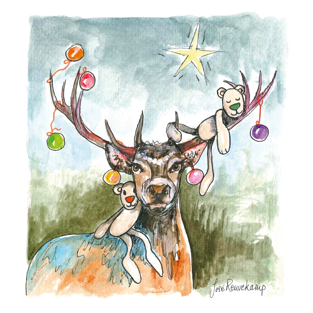 Deze kerstkaart is speciaal ontworpen voor het Ronald McDonald Huis Zwolle door kunstenares Jose Reuvekamp. Een prachtig handgeschilderd rendier, versierd met kleurrijke kerstballen en knuffelberen. Wens al je vrienden, familie en kennissen fijne feestdagen toe met deze kerstkaart en steun tegelijkertijd het goede doel. Deze kaart is ook geschikt als zakelijke kerstkaart voor alle sectoren. Op de binnenzijde van deze kaart voor het goede doel is er ruimte voor jullie eigen bedrijfslogo.