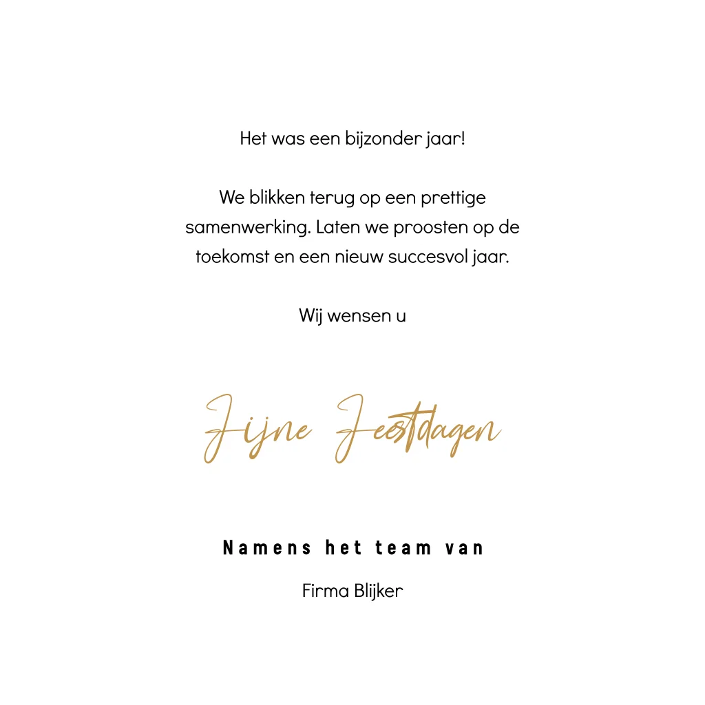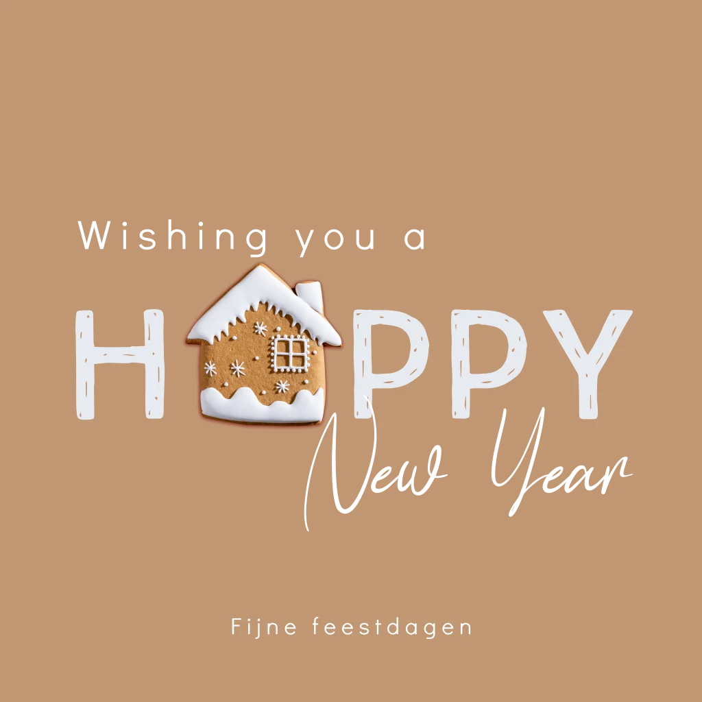 Zakelijke kerstkaart met trendy nude tint achtergrond. De kaart is afgewerkt met goudfolie en een kerstkoekje in de vorm van een huisje als de letter 'A'. Pas de zakelijke kerstkaart helemaal naar eigen wens en smaak aan of schakel onze gratis opmaakhulp in.