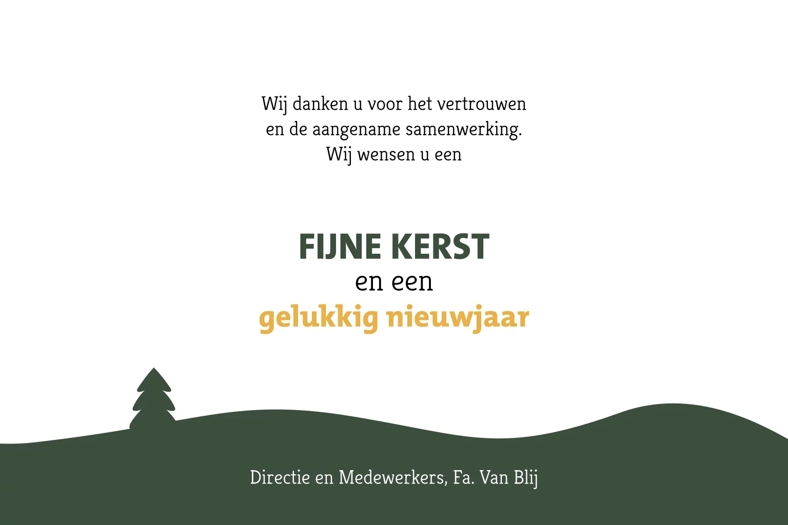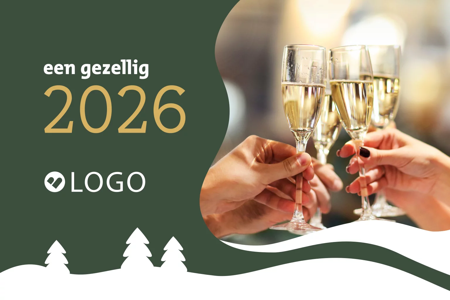 Groene zakelijke kerstkaart met sneeuw, kerstbomen en foto. Op de foto wordt er met champagne geproost. De foto is ook vervangbaar voor een eigen bedrijfsfoto. Geschikt voor alle sectoren, maar zeker ook leuk voor de horeca sector. Teksten en lettertypes zijn aan te passen in de editor.