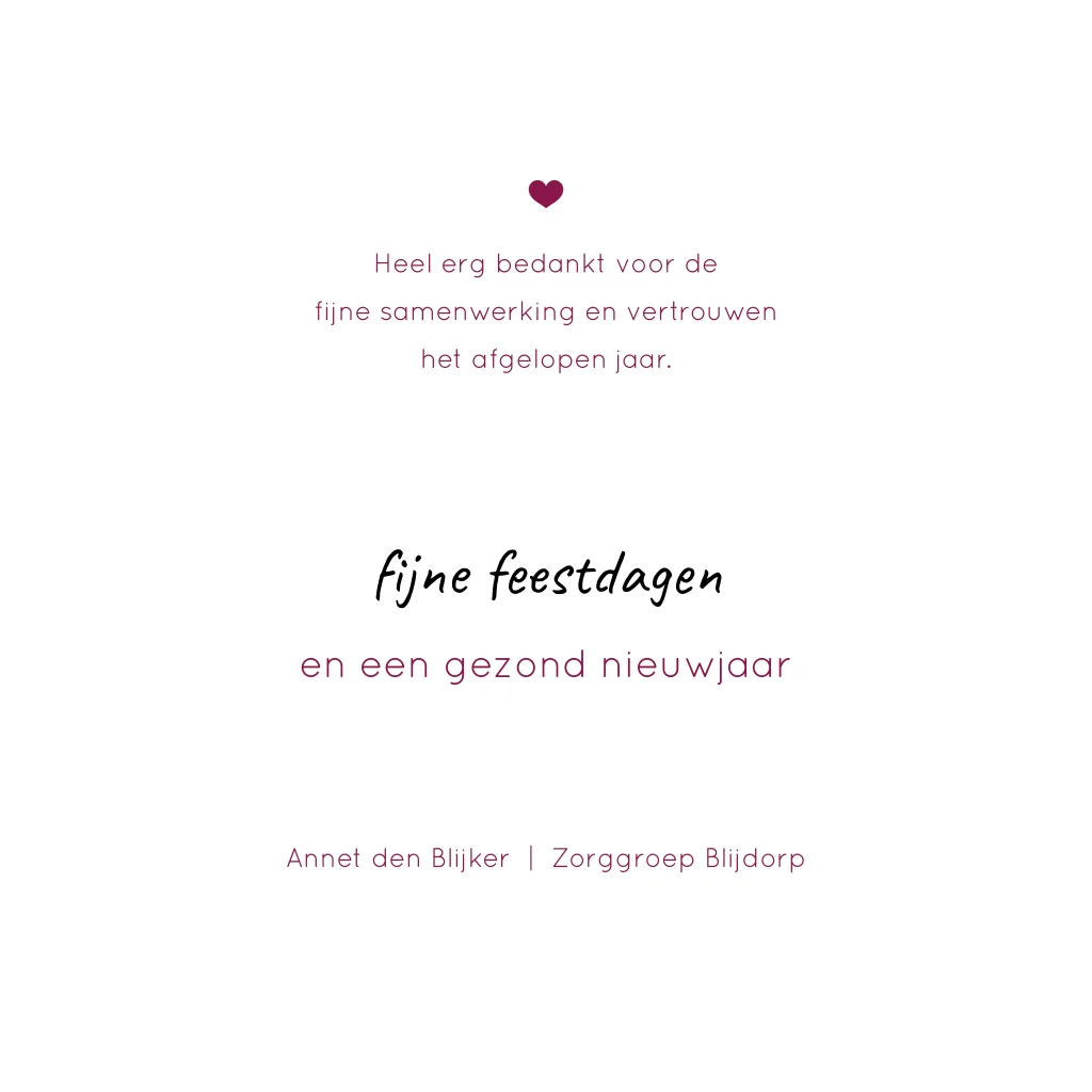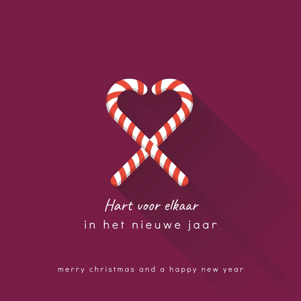 Feestelijke zakelijke kerstkaart met de tekst 'Hart voor elkaar in het nieuwe jaar' met in hartvorm twee Kerst zuurstokken. Wens hiermee je zakelijke relaties fijne feestdagen. Leuk voor een bedrijf in de zorg. Op de binnenzijde is ruimte voor je eigen bedrijfslogo.