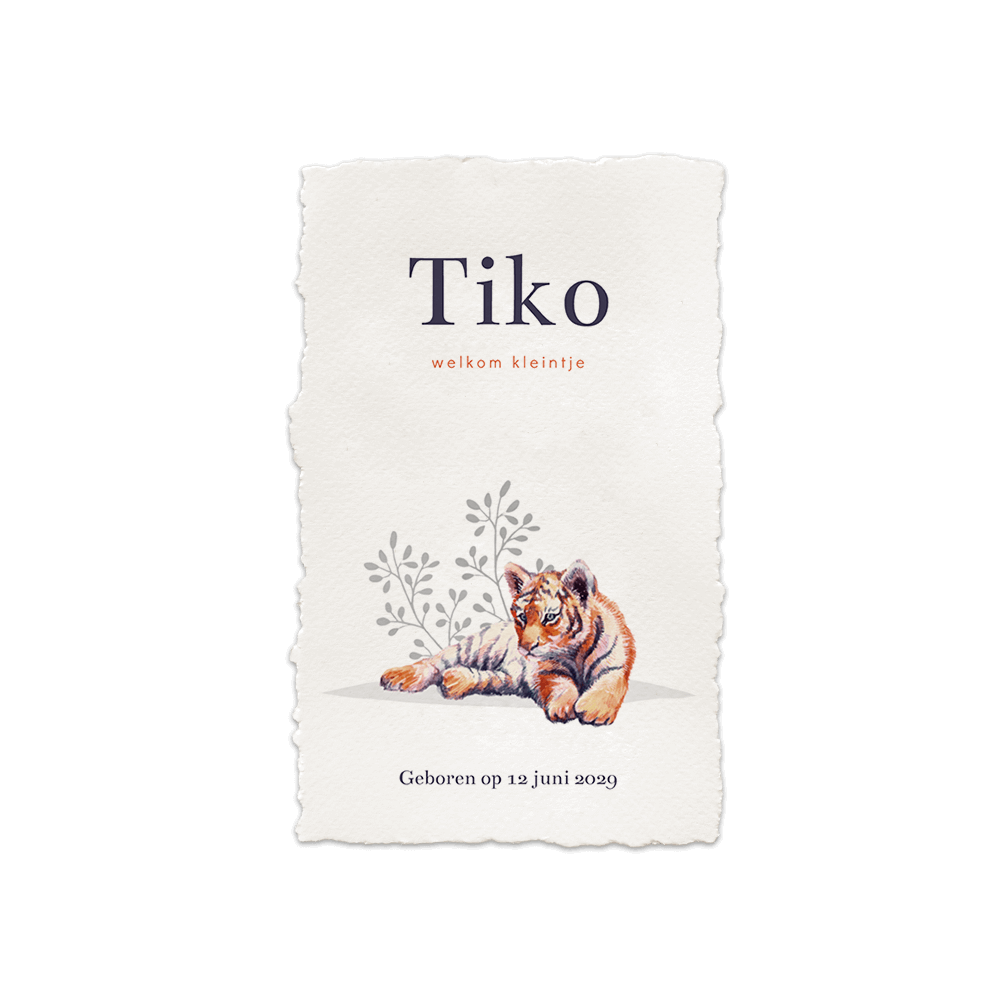 Origineel geboortekaartje voor een jongen met handgeschepte papier look. Op dit unieke geboortekaartje Tiko zie je een tijger welpje. Het geboortekaartje kun je zelf voorzien van een handgeschepte papieren look door middel van het liniaaltje.