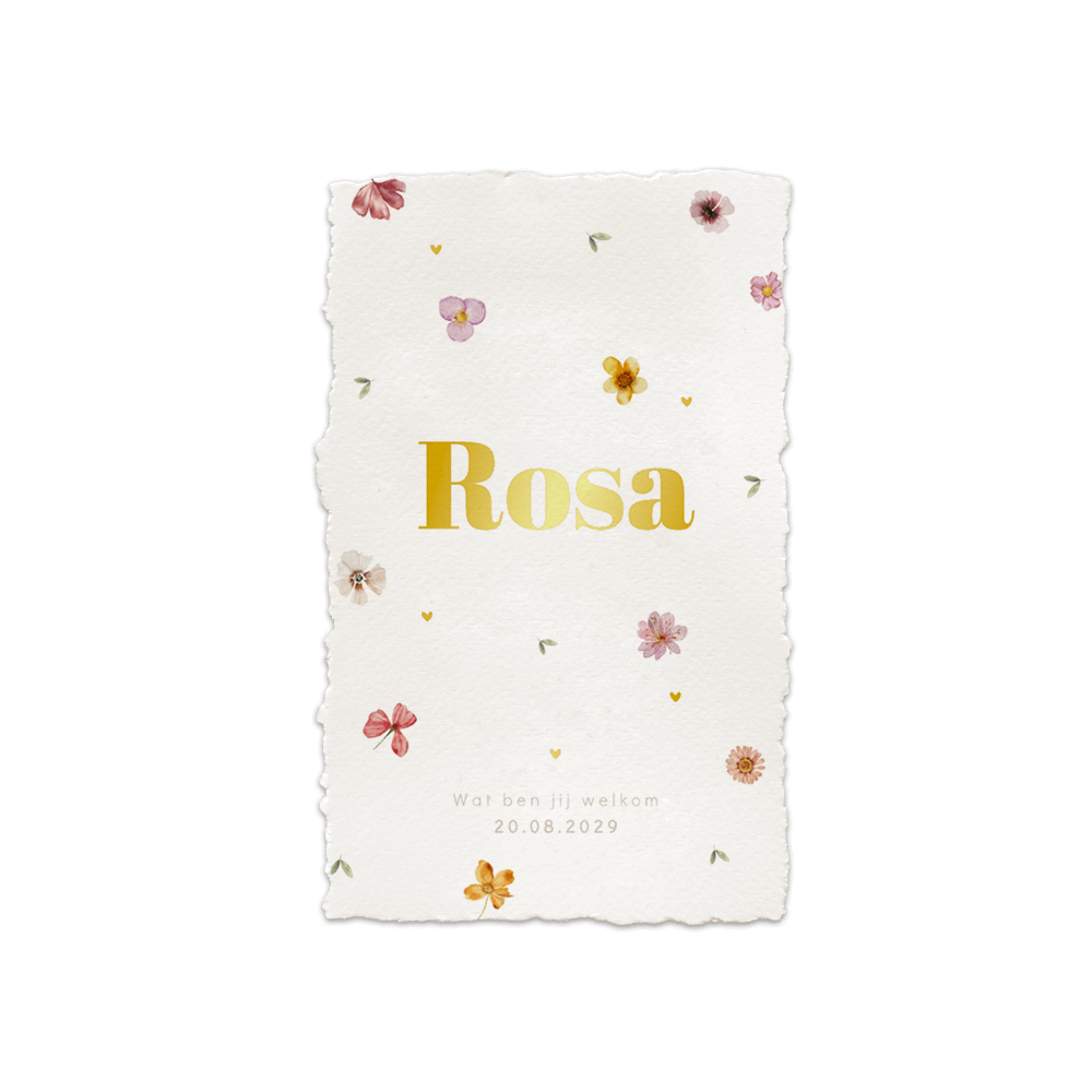 Een stijlvol geboortekaartje met een handgeschepte papieren look. Dit geboortekaartje Rosa straalt stijl uit en is voorzien van prachtige bloemen en goudfolie. Het goudfolie zorgt voor een extra vleugje luxe. Deze kaart heeft het formaat 11 x 17 cm. Pas naar eigen wens aan in onze online editor. Hulp nodig met ontwerpen? We helpen je graag!