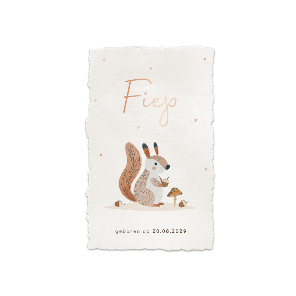 Origineel en luxe geboortekaartje voor een meisje met foliedruk en een handgeschepte papier look. Op dit unieke geboortekaartje Fiep zie je een schattige eekhoorn met paddenstoel met op de achtergrond lieve hartjes in roséfolie. Een leuk geboortekaartje voor een kindje dat in de herfst wordt geboren. Dit geboortekaartje kun je zelf voorzien van een handgeschepte papieren look door middel van het liniaaltje.