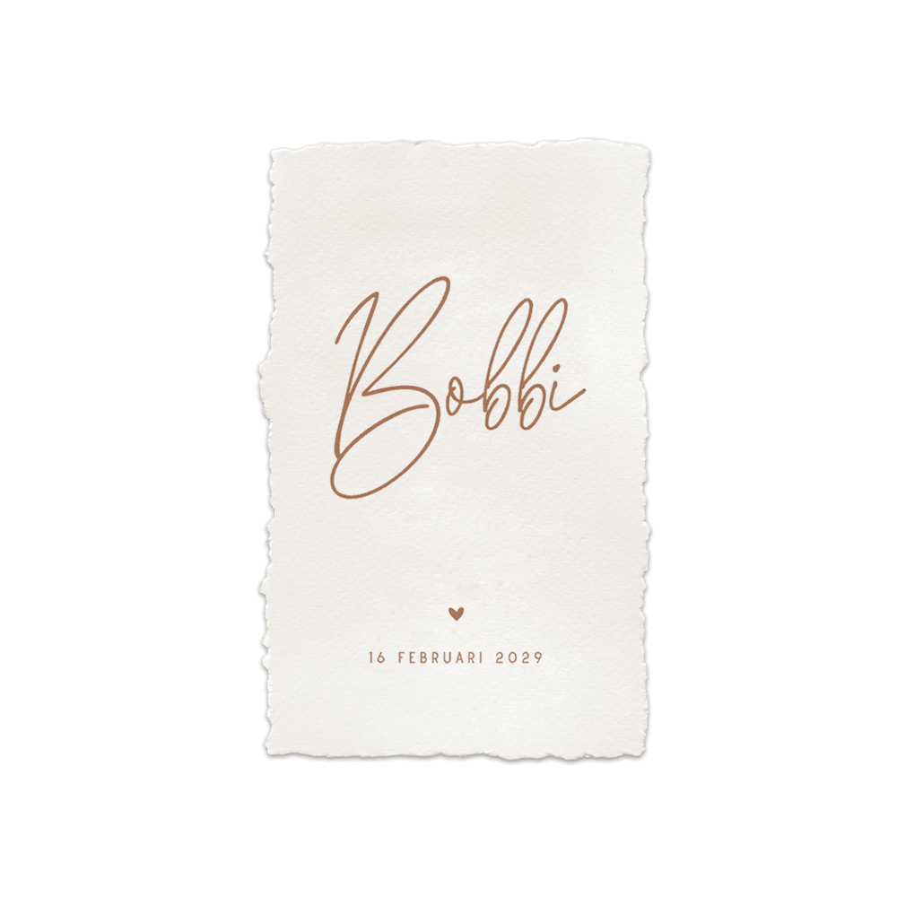 Basic unisex geboortekaartje voor een meisje of een jongen. Het design van dit geboortekaartje Bobbi is neutraal maar de uitstraling is origineel door de handgeschepte papier look. De handgeschepte papieren look kun je zelf creëren door middel van het liniaaltje. Kies voor de zand envelop om de kaart helemaal af te maken.