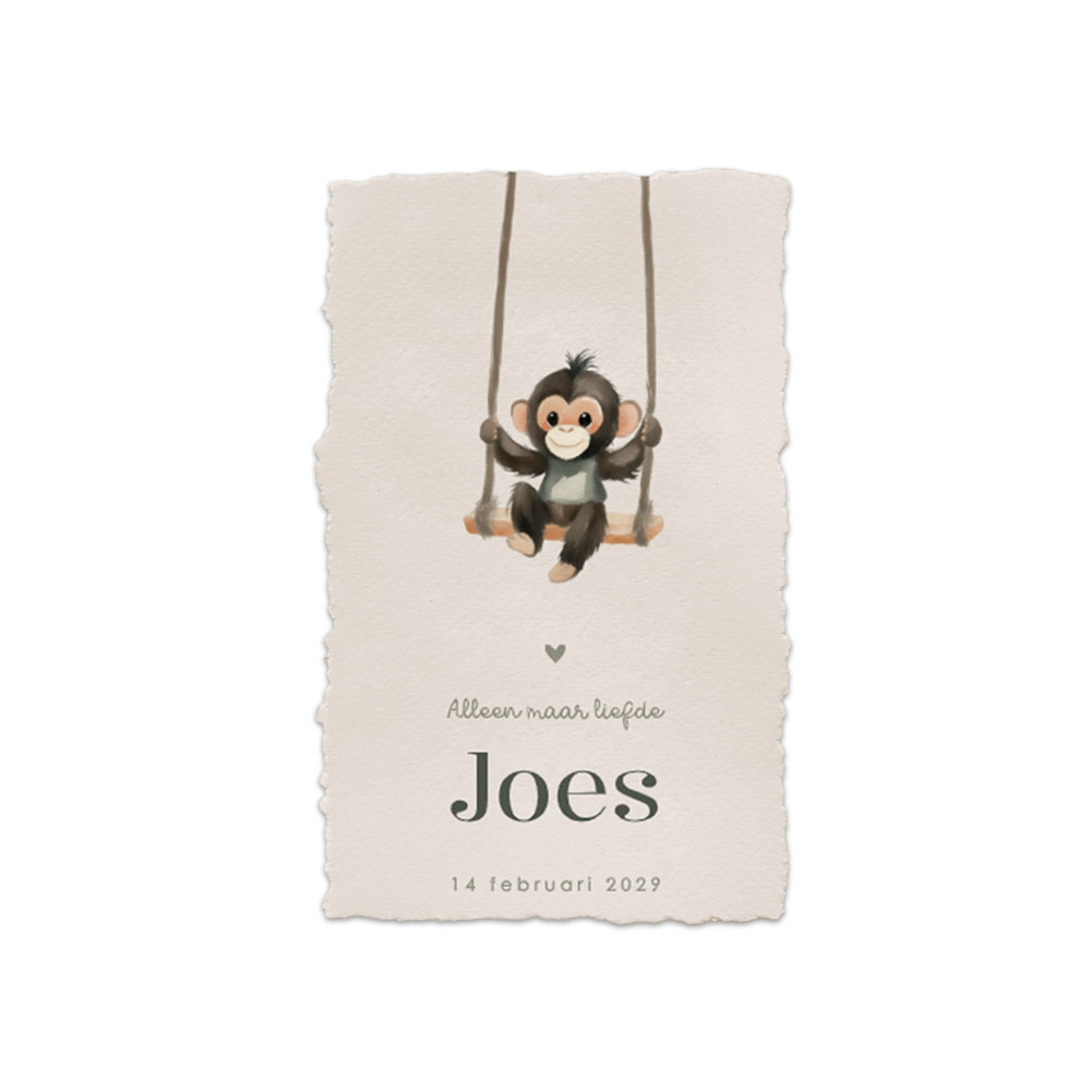 Een superschattig geboortekaartje voor een jongen met een schommelend aapje. Op dit geboortekaartje Joes zie je een klein babyaapje die aan het schommelen is met de tekst 'alleen maar liefde'. Pas naar eigen wens dit geboortekaartje met handgeschepte papieren look aan in onze online editor voor jullie zoon.