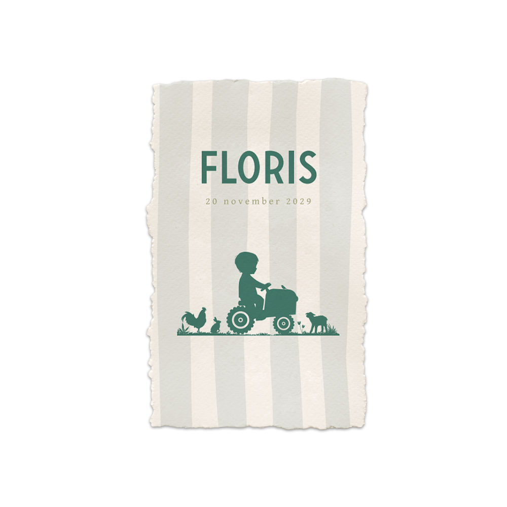 Origineel jongens geboortekaartje met handgeschepte papier look. Dit unieke geboortekaartje Floris heeft een patroon van strepen met een silhouet van een jongen op een tractor met boerderijdieren. Het geboortekaartje kun je zelf voorzien van een handgeschepte papieren look door middel van het liniaaltje.