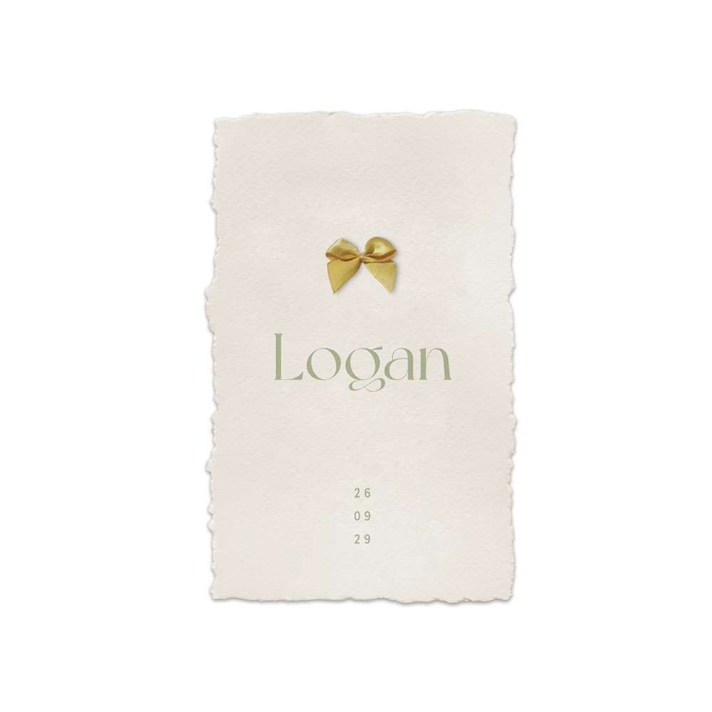 Dit unisex geboortekaartje Logan heeft een handgeschepte papieren look. Op dit kaartje zie je een klassiek ontwerp met een echt strikje met een beige achtergrond. Dit geboortekaartje heeft het formaat van 11 x 17 cm. Pas dit geboortekaartje voor een jongen of meisje aan in onze online editor voor jullie persoonlijke touch. Dit geboortekaartje is geïnspireerd op het kaartje van Roos van der Aa.