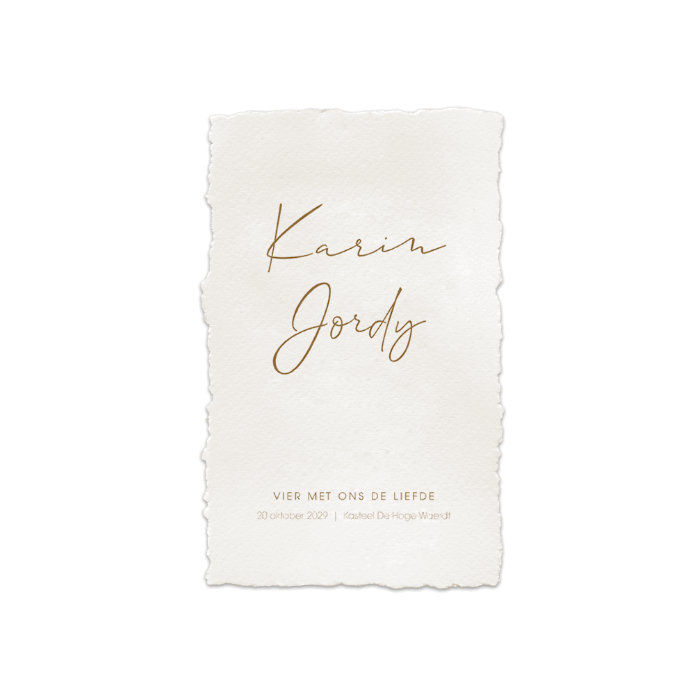 Een basic trouwkaart in een handgeschepte papieren look. Deze huwelijksuitnodiging heeft een subtiel en rustig design. Pas de teksten en kleuren van deze kaart makkelijk aan in onze online editor. Het formaat van deze kaart is 11 x 16 cm. De zand envelopkleur maakt deze uitnodiging helemaal in stijl af.
